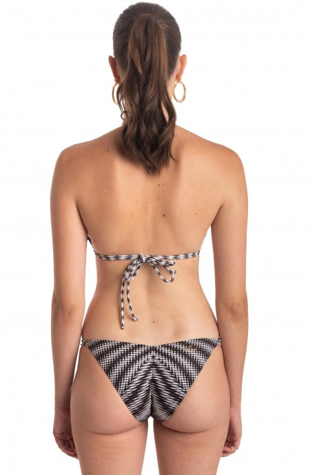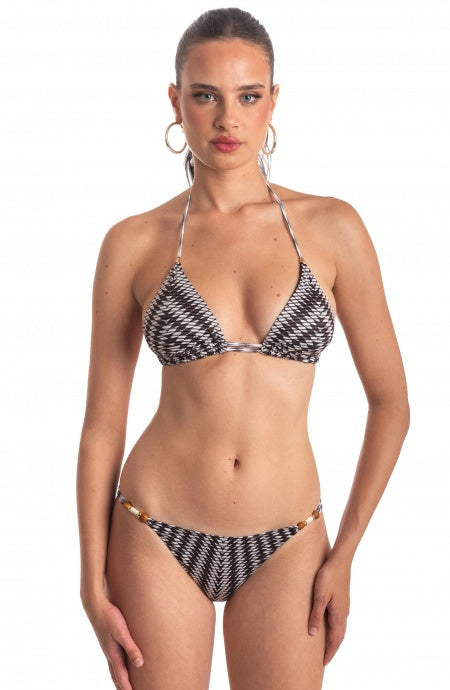 Flowing triangle bikini in devorated rib fabric with removable padding and double underbust for added support. The bikini features an original Optical print reinterpreted with a modern twist. The low coverage version features glamorous accessories on the sides of the bottom.