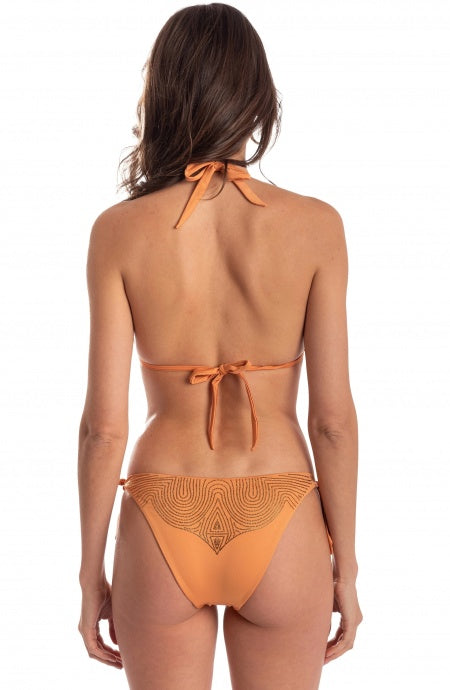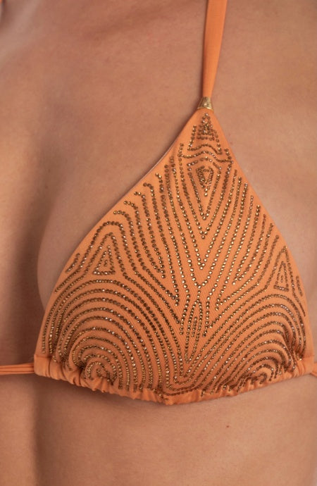 Sophisticated and chic triangle bikini with removable padding made of semi-glossy lycra. Beautiful Swarovski crystal work creates a tribal and exclusive design on the cups and bottom. The perfect fit and sophisticated aesthetic make it a garment of unparalleled craftsmanship.