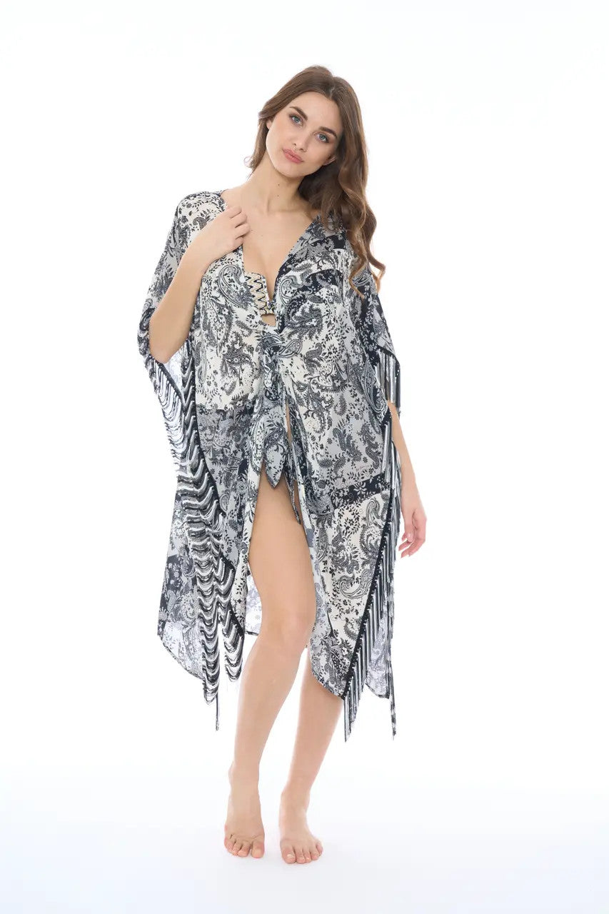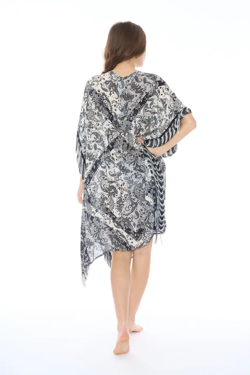 Printed Poncho with Black and White Fringe