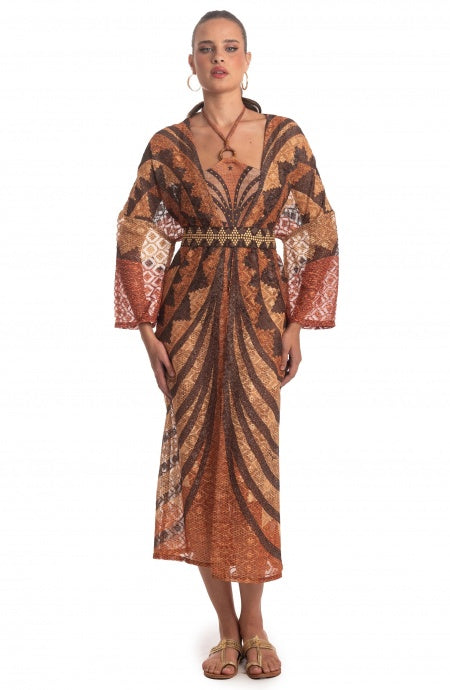 Long kimono made of fine fil coupé fabric and enhanced by the placed African Interlace print formed by triangles and concentric circles that are expertly composed to enhance the silhouette. The removable sash belt, decorated with an elegant ethnic-style stud detail, emphasizes the waist, adding a touch of femininity and style. Lightweight and easy to wear, the kimono completes summer looks with a touch of elegance and sophistication.