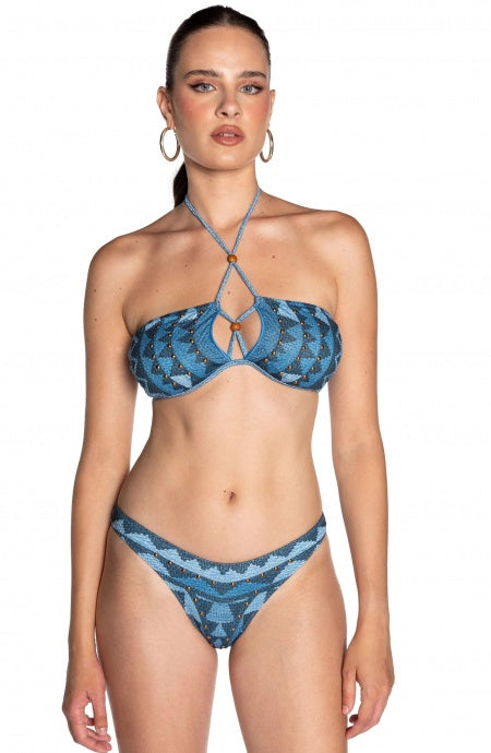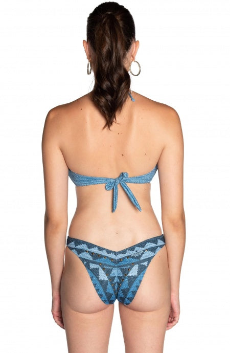 Bandeau bikini with center crossover and removable padding. Ties around the neck give added support and are embellished with glamorous accessories. Placed African Interlace print features concentric triangles and circles that are cleverly composed to enhance the silhouette. Dome-shaped studs in coppery gold fan out making the garment unique and special.