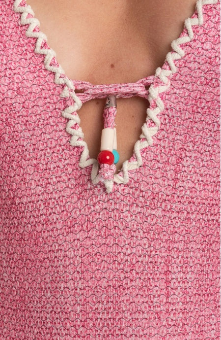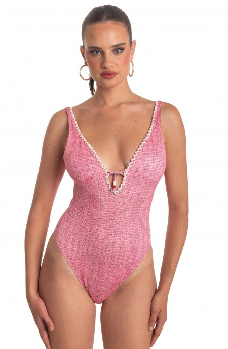 One-piece swimsuit with removable padding in soft Jute print embossed lycra. Neckline with dainetto interlace embroidery profile adjusted by glamorous accessories. Deep neckline also at the back with lace that adjusts the fit of the garment. Can also be used as a bodysuit or in combination with clothing from the African Woven Collection.