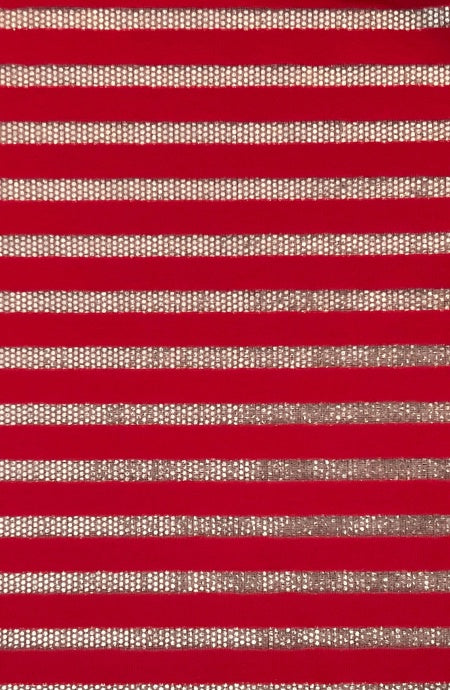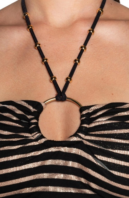 Bandeau dress with bead-embellished neck lacing and a gold nickel-free center ring. The dress is made of devorated striped viscose jersey fabric lined with gold lycra. Drawstring to customize the length.