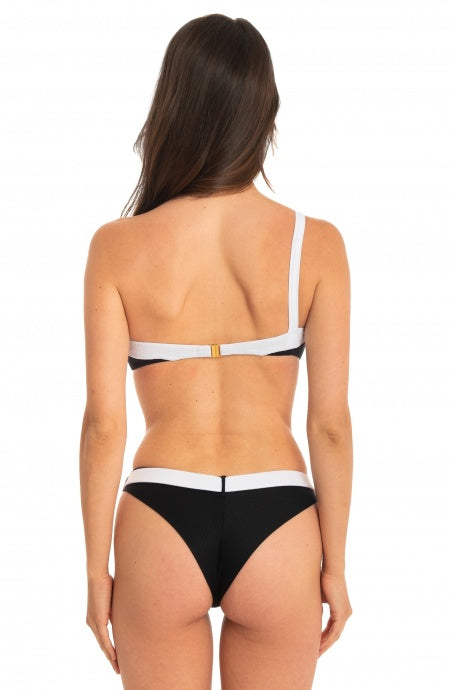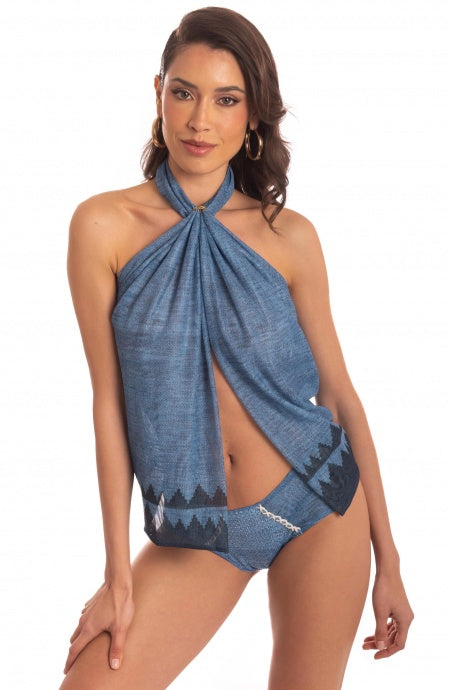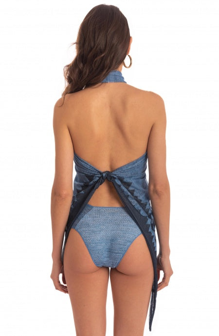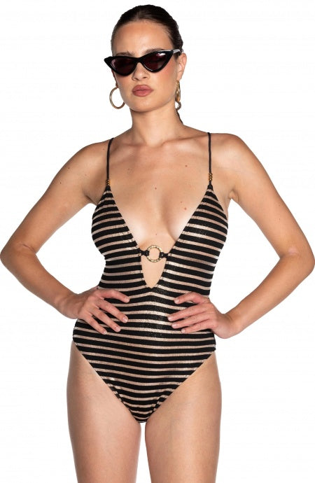 Marina Gold one-piece swimsuit with removable padding in devorated striped viscose jersey fabric lined with gold lycra.. The plunging neckline is embellished with a nickel-free gold center ring in the center bust that defines and enhances it. The ties at the back create a sensual and feminine crossover and are enhanced by gold beads. Back curl enhances the B-side.