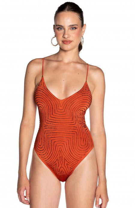 One-piece swimsuit with removable padding. Solid-color lycra fabric is embellished with beautiful Swarovski crystal work that creates an exclusive, tribal design. Ties create sensual crisscrossing on the back. Refined and elegant, it is easily paired with a sarong in the same fabric or tulle so you won't go unnoticed. Can also be used as a bodysuit.